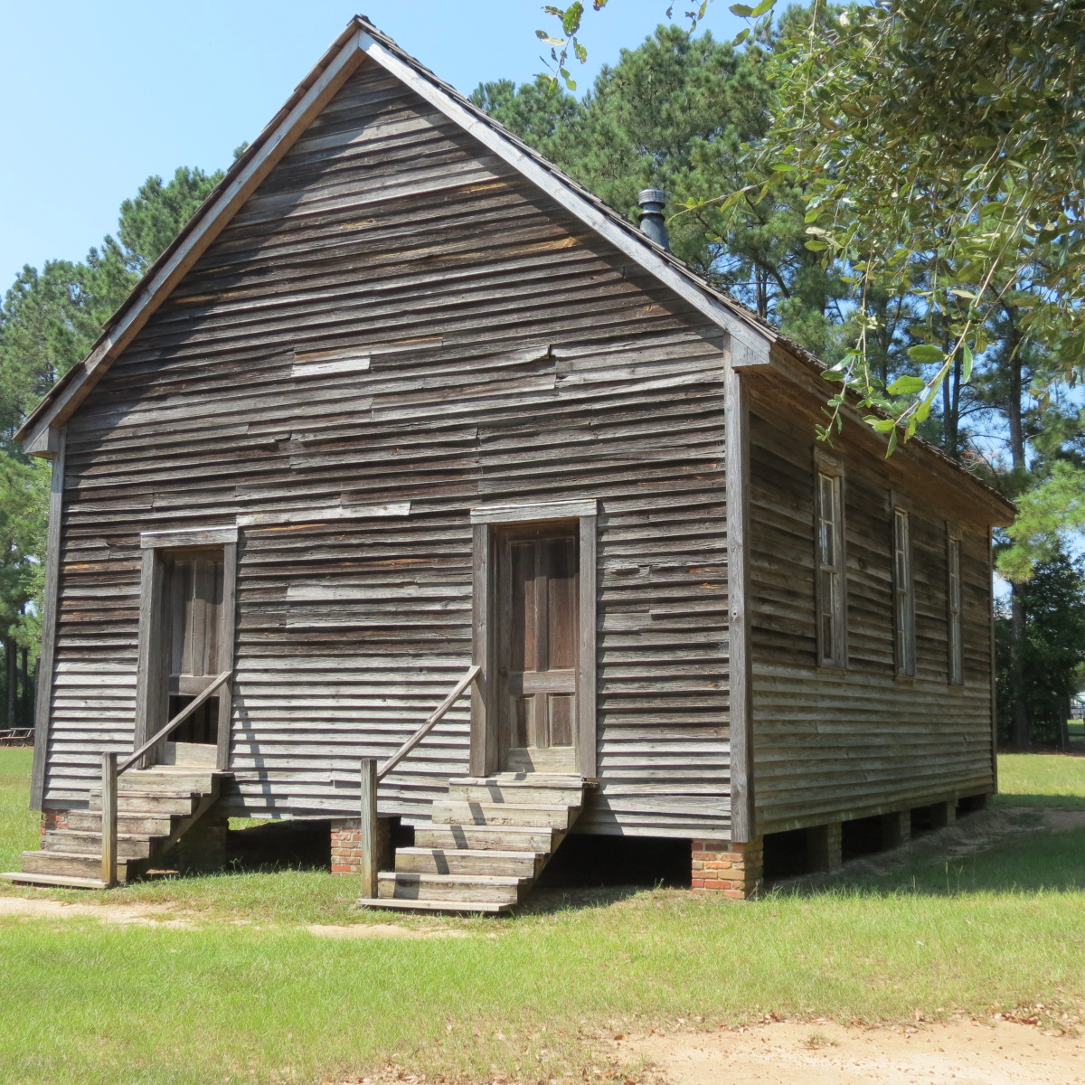 It was built as a simple structure—not much different than it appears today. Rectangular in shape, the schoolhouse features a pitched shake roof, gable ends, two front doors, and eight small windows. The structure includes a modified-balloon frame overlaid with machined clapboard on the exterior and finished with interior plank walls. The flooring is of long-leaf pine, milled as tongue and groove, and would have been regularly coated with linseed oil.